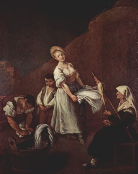 Curator: Ah, here we are in front of “The Hunters and the Farmers,” an intriguing piece. Though undated, its style evokes the atmosphere of 18th-century genre painting, very likely attributed to Pietro Longhi. Editor: Immediately, it whispers stories of rest after labor... the slouching figure on the right, almost swallowed by the shadows, that fatigue just resonates. Curator: It’s a snapshot, isn't it? We're invited into this intimate, almost clandestine, moment. But let’s peel back those shadows. What symbolic cues can you unearth? Editor: Well, the contrast between the drowsy figure and the women, one with a spindle and one with a woven basket. They suggest opposing cycles, the weariness of day's end against enduring work of home and hearth. Even their clothing; deep blues and earthy whites suggesting permanence. Curator: I see it! It's like a quiet debate—one between action and stillness, labor and reprieve. The standing figure...the hunter... is an almost voyeuristic presence. A world away, with his tools and purpose. Editor: Indeed. Hunters and Farmers...these traditional masculine and feminine spheres are poised as counterparts. Their quiet domestic sphere is so much about nourishment and care; the painting really conveys so much cultural symbolism about society in that era. It is interesting to speculate on why this might be classified as narrative painting too. Is this about society itself? Or more focused on class tensions maybe? Curator: Could be, I think with these genre pieces that the reading changes through the eyes of the viewer so the point is less that and more a focus on humanism that we find in Rococo works, as much as Baroque Editor: Interesting point. I suppose that for me it speaks more to cultural memory. Curator: And, on that note, that's about our time on this particular piece, intriguing and dense with human moments and a cultural message. Editor: A brief immersion into the enduring dance of labor and rest, and symbols that stay with us still.