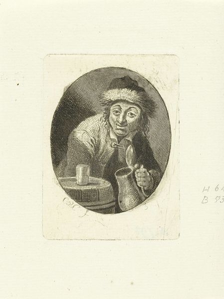 Cornelis van Cuylenburgh II created this small etching of a man with a pitcher and glass. This image gives us a glimpse into the Dutch Republic, a society marked by its burgeoning merchant class and vibrant tavern culture. During the 18th century, drinking establishments were more than just places to consume alcohol. They were social hubs where class lines blurred, and news and ideas were exchanged. Cuylenburgh’s man, with his fur hat and slightly disheveled appearance, hints at the complexities of identity. Is he a laborer seeking solace after a long day, or a member of the bourgeoisie indulging in leisure? The ambiguity invites us to reflect on the social dynamics of the time and how individuals navigated their roles. There's an emotional honesty here, too. Perhaps Cuylenburgh is inviting us to consider the human desire for connection and escape, found in the simple act of sharing a drink.