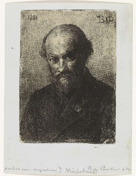 Editor: Here we have Bastiaan de Poorter’s self-portrait from 1863, created using drawing techniques with ink, graphite, and charcoal on paper. It feels remarkably intimate; like a direct, almost confrontational gaze from the artist. What's your interpretation? Curator: I see the etching as a product of its time, a period heavily influenced by the rise of individual expression and self-awareness fostered by burgeoning democratic ideals. How does an artist, particularly one from the middle class, begin to represent themselves? This portrait exists within a context of evolving social structures and increasingly accessible artistic tools. Editor: Interesting. I hadn’t considered the social accessibility aspect. Curator: Precisely. Consider the printmaking medium. Prints offered greater affordability and wider distribution compared to painted portraits, challenging the traditional dominance of the aristocracy in image-making. Editor: So, it democratizes portraiture? Curator: Indeed. It puts self-representation into the hands of a broader demographic, reflecting a shift in societal power dynamics. This wasn't simply about vanity; it was a claim to visibility and agency within a changing social landscape. How does the somewhat melancholic mood play into this claim, do you think? Editor: I guess that the direct gaze and sombre expression aren't just personal; they become almost a statement of individual worth outside of established hierarchies. Curator: Exactly. It moves portraiture away from celebrating solely wealth and status toward capturing internal states of being and the value of lived experience in the modern era. This resonates deeply, especially considering the changing socio-political context of the 19th century. Editor: It makes me rethink what a self-portrait could signify back then; it wasn't just about looks. Curator: Right, and the proliferation of printed images undoubtedly helped shape public perception and the role of the individual artist in society. Hopefully, this conversation allows us to question some of our pre-conceived notions and explore this work from a different vantage.