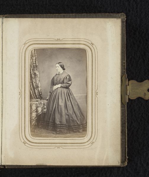 This photograph, "Portret van een staande vrouw," was produced by The London School of Photography, a commercial photography studio popular in the nineteenth century. The photograph captures a woman in a large checkered dress, posed formally next to an ornate table. In this era, photography was still a relatively new medium, and portraiture became a powerful tool for self-representation, particularly for the burgeoning middle class. Consider the subject's pose, the carefully chosen dress, and the presence of books on the table; each detail speaks to the sitter's desire to present herself in a specific light, likely emphasizing her respectability, education, and social standing. These images offer a window into the aspirations and self-fashioning of individuals navigating a rapidly changing world. In a time when gender roles were clearly defined, this portrait encapsulates the complexities of female identity, somewhere between societal expectations and personal expression. The woman’s gaze and posture communicate both constraint and a quiet sense of self-assurance.