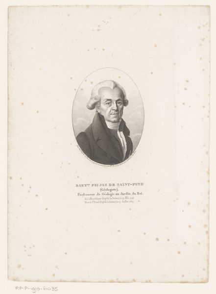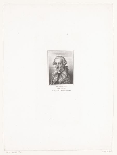 Curator: Standing before us is the “Portret van Étienne Antoine Boulogne,” created in 1830 by Bernard Romain Julien. This intimate work is an etching, currently held in the collection of the Rijksmuseum. Editor: There’s a stark elegance to this print, isn't there? The way the figure emerges from the shadows feels almost severe, yet there is an undeniable warmth conveyed in the details of the face. Curator: Indeed. Considering Julien’s oeuvre and the historical context, this work participates in a broader conversation around identity and representation during a period of significant social upheaval in France. It speaks to power structures inherent in portraiture, particularly within the Church. Editor: Focusing on the craft itself, the etcher's technique really emphasizes line and form, doesn't it? Look at the intricate rendering of the robes. I'm curious about the choices that went into selecting this printing technique—etching lends itself to a certain degree of precision, almost an industrial feel to image-making. It democratizes access in a way painting couldn’t, allowing images like this to spread widely. Curator: Precisely. Think of the rise of the bourgeoisie, their demand for representation. This piece reflects and perhaps shapes bourgeois desires of importance and religious positionality within this new societal arrangement. The sitter's position underscores the cultural weight placed upon his station. Editor: The texture of the paper also adds something. I wonder about its sourcing—the specific mill, the labor involved in its making. Even seemingly small details of materiality carry histories with them. Curator: I agree. By focusing on paper, production, we also see the material reality which grounds artistic creation, how it enables artistic and political projects and creates both tangible artifacts but also contributes towards historical imaginaries. Editor: I find this consideration fascinating. It allows me to appreciate the portrait as not just an image of a man but also as a trace of the conditions, human energy, and technical knowledge that shaped its existence. Curator: Absolutely, looking closer at the way art is made and what it does in its historical circumstances shows the real power that art has in shaping identity. Editor: Indeed, considering the work as more than a pretty picture gives insight into both aesthetic strategies, and productive potential as a key technology of visualization.