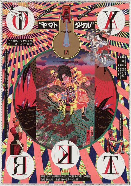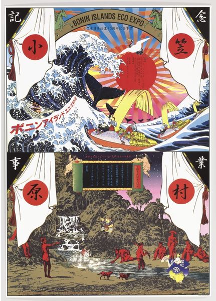 Curator: Tadanori Yokoo's mixed-media work, "Fuji Tarzan," created in 1997, really demands our attention. Editor: It absolutely assaults the senses! The red is so vibrant, almost overwhelming. Is that Mount Fuji in the background? It’s as if a traditional landscape painting has been hijacked by pop art and something…primal. Curator: Precisely! Yokoo often juxtaposes traditional Japanese motifs, like ukiyo-e imagery, with contemporary elements and even what some might call erotic art. His works interrogate cultural identity within rapidly changing societies. He had also worked previously on theater set designs, which shows here, maybe influencing this sort of collage style approach. Editor: That juxtaposition is key. You have the iconic, serene Fuji, but it's surrounded by these turbulent red waves, a screaming Tarzan figure, snakes…there's an element of chaos and almost a feverish quality. It challenges the traditional ideal of Japanese landscape as calm and contemplative. And it seems there's even graffiti art influencing some visual forms. Curator: Considering Yokoo's position as a graphic designer, his artistic vision blurs boundaries, which is particularly relevant when looking at themes like the relationship between colonizer and colonized, as "Tarzan" suggests. Editor: I can see how that historical context informs this work. The screaming figure is placed there specifically, in this mix, for a certain dialogue, I imagine. In that context the whole composition begins to scream colonialism, hyper-masculinity, and perhaps even the anxieties around Japan's postwar identity and America's pop-cultural imperialism. Curator: This is Yokoo asking, and getting us to ask, vital questions about authenticity and representation. Looking at the art through the framework of historical changes allows us a better grasp of the artwork's narrative. Editor: Seeing the political undercurrents really makes me appreciate Yokoo's fearless experimentation. It takes a traditional scene of natural serenity, distorts it through an intersection of global art and identity, then amplifies that dissonance for effect. Curator: A jarring visual feast, certainly one which holds lasting questions in this conversation. Editor: Yes, and hopefully a memorable and thought-provoking visual experience for everyone experiencing it today.