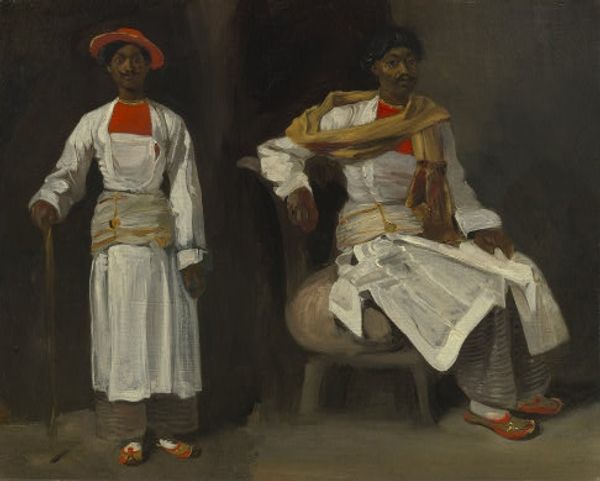 Curator: Standing before us is "Study for Seated Figures for ‘El Jale’," an oil on canvas painted circa 1882 by John Singer Sargent. Editor: My immediate impression is one of captured movement and contrast. The vibrant red and stark white against the muted background are arresting, giving off an aura of Spanish dynamism. Curator: Sargent created this preparatory sketch while planning for "El Jaleo," his ambitious, large-scale depiction of a Spanish flamenco performance, meant to impress the Parisian Salons. "El Jaleo" translates to “rowdiness.” This smaller oil study is significant, a record of Sargent grappling with figure placement and composition. Editor: Note how Sargent uses impasto—thickly applied paint—particularly in the dancer’s dress. This not only adds texture but also directs light across the canvas, animating the figures even more. The composition is strikingly unbalanced, further conveying tension. Curator: Indeed. Consider the historical context: Sargent was an expatriate artist, navigating cultural expectations. Paintings of Spanish Roma, particularly flamenco dancers, were quite popular, though fraught with orientalist undertones. How does this study speak to broader artistic trends of the time? Editor: Looking at the rapid brushstrokes, there's a tangible sense of energy but it could just as well represent the energy on location with the performers! His application reminds us this is, in its raw form, a working painting as much as it’s a view of an observed and captivating cultural performance. Curator: He seems most concerned with capturing essential gesture and light effects as a means of understanding movement and drama as he plans a future piece. The seated figures give us hints of Spanish dress while his main attention rests on the dancer herself. Editor: It would be interesting to compare it to "El Jaleo" itself, to study how Sargent took preliminary work into final execution in ways both deliberate and improvisational. Curator: This study unveils the development of Sargent's mature style and sheds light on a fascinating historical context. Editor: And a look at how a painter seeks to understand—through form and technique—something captivating observed.