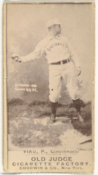 Editor: Here we have a baseball card from 1889, featuring Henry Carl "Hank" Gastright, a pitcher for Columbus. It’s from the "Old Judge" series, produced by Goodwin & Company for their cigarette brand. It appears to be a photographic print. There’s a sepia tone to it that makes me think of old photographs. What catches your eye about this piece? Curator: What's most compelling here is not the sport itself, but the confluence of factors contributing to its production and circulation. Think about it: this isn’t just a picture; it's a commodity produced as part of the tobacco industry, designed to encourage consumption. Consider the material conditions—the photographic process, the printing techniques, and the distribution networks—all intertwined with the rise of mass culture and advertising. The image serves as both a promotional tool for Old Judge Cigarettes, normalizing tobacco use, and as a collectible item, encouraging further engagement with the brand. Editor: That makes me think about the players themselves. Were they compensated for their images being used in this way? Curator: That's an interesting and pertinent question. More than likely the baseball players benefited minimally if at all. In those days there wasn’t strong players' unions that we have now, which brings the conversation around to labor. The workforce, predominantly women and children at the time, manually inserted those cards into cigarette packages, essentially cheap, invisible labor propping up a burgeoning industry. Don't you find that context changes our view of this card? Editor: Absolutely! Seeing it this way really opens my eyes to all the layers involved beyond just a picture of a baseball player. It is an artifact deeply rooted in labor practices, consumer culture, and industrial processes. Curator: Exactly. It allows us to re-evaluate this baseball card beyond its face value and analyze the material conditions of its making.