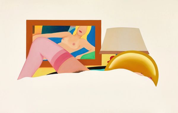 Curator: Tom Wesselmann’s “Study for Bedroom Painting #25,” from 1967. It’s acrylic on canvas, exhibiting a decidedly Pop Art sensibility. Editor: It feels quite abstract for a bedroom scene. What stands out to you the most about it? Curator: I’m drawn to the physicality of it. Wesselmann's process, the actual layering of acrylic, flattens the composition and almost eliminates depth. He challenges the traditional idea of painting as illusion. Do you see how the clear outlining almost feels like manufactured pieces laid together? Editor: Yes, I see that! The sharp edges separating the colors... it's almost like an assembly. Curator: Precisely. It mimics mass production, pointing to a culture increasingly defined by consumer goods and factory-made objects. Even the cheetah print ground. Is that a rug? Is it fabric? It becomes another manufactured element. It isn’t rendered, it is presented. Wesselmann isn’t creating; he is assembling an idea about the domestic landscape, blurring the line between “high art” and the readily available imagery of advertising and commercial design. He doesn't show emotion but represents an idea. Editor: So he's taking elements from everyday life and recontextualizing them as commodities themselves? Curator: Exactly. How does this understanding shift your initial reaction? Editor: It's less about the emotional content of a domestic scene, and more about how that scene is constructed through materials and replicated forms of mass production. The art isn't expressing emotion but analyzing cultural manufacturing. Curator: A critical distinction to make! Editor: I see now the intentional choices in medium and color are critical in building this social and commercial commentary. Curator: Absolutely. Material and production are inextricable from its message.