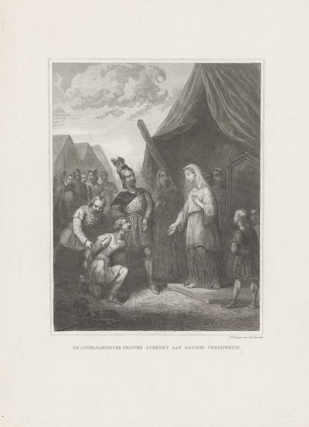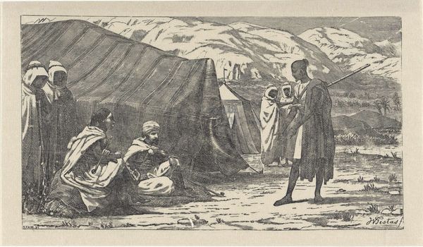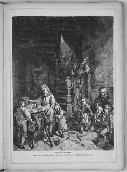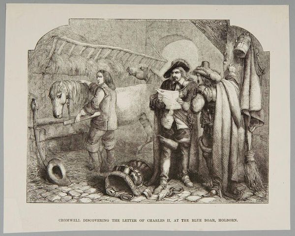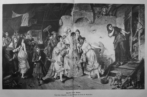 Taras Shevchenko created this intaglio print, Vessels Council, in 1844. Immediately, the textured thatch roof, rendered with short, hatched lines, draws the eye, contrasting with the smoother areas of the figures’ garments. This interplay of texture and form creates a dynamic visual experience. Structurally, the composition is anchored by the seated figure at the center, around whom the standing figures form a semi-circle. The artist uses line and form to suggest a narrative, but it stops short of being conclusive, leaving much open to interpretation. This etching destabilizes established meanings through its focus on rural life. The artwork emphasizes the structure of everyday life and social gatherings rather than the idealized and heroic narratives, engaging with new ways of thinking about representation. The lack of a clear focal point questions traditional hierarchies, proposing a flatter, more democratic visual field.