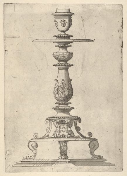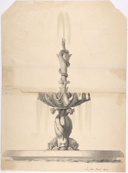 Curator: This exquisite drawing, “Design for a Candelabrum,” was created sometime between 1826 and 1837 by Edgar George Papworth Sr. It resides here at the Metropolitan Museum of Art, a testament to the enduring appeal of Neoclassical design. Editor: Oh, my word, it's… imposing! The candelabrum feels so grand, almost theatrical. It evokes a sense of antiquated, candlelit feasts in dark banquet halls. So much going on… Curator: Precisely! Papworth Sr. was clearly working within the Neoclassical movement, channeling its penchant for symmetry, idealized forms, and references to classical antiquity. Observe the careful rendering of each element in pencil, his dedication to formal balance…it is just a functional sketch for later realisation, but its still so complete in itself! Editor: It's like a fantastical architectural structure. Those majestic birds supporting a tier… swans, perhaps? Are holding candles? And above, a series of intricate cylindrical sections crowned by stylized raptors. What a dramatic flourish! Curator: It’s indeed full of allusions: Swans—symbols of grace, love and devotion. The layered structure is common to neoclassicist design and highlights a period fascinated with structure, and a sense of ordered complexity, expressed through ornament. You have to imagine such a creation dominating a formal space, signaling prestige. Editor: It feels…aspirational, even ostentatious! Given the socio-political context of the early 19th century—the rise of industrialisation and emerging social classes—how does this drawing function? Was it an actual commissioned piece, or more of a display of creative possibility? Curator: Great question! It's challenging to be certain. It is likely created within the patronage system, meant to court wealthy clients. But also a sign of its time as such ornamental and functional item shows a kind of luxury accessible just to the upper classes. Imagine it being put in the homes of the rich. The candelabra almost projects authority... Editor: It certainly radiates status. You know, even just the choice of graphite adds a lovely warmth, a gentleness despite its monumentality. A reminder of human hands at play… Curator: I fully agree. Although the final design may have never been realized, "Design for a Candelabrum" presents a beguiling and elegant insight into a bygone era's aesthetics and power structures. Editor: Absolutely, I will think of both luxury and control with its image next time. Thanks!