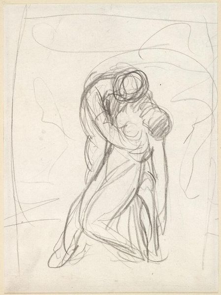 Editor: Here we have Arthur Hughes' pencil sketch, "Study for ‘The Eve of St Agnes.’" The composition feels so intimate, like we're intruding on a stolen moment. What do you make of its raw, unfinished quality? Curator: It's beautiful, isn’t it? Think of it as a whispered secret, a glimpse into the artist's creative process. The sketchiness captures the lovers' furtive embrace, a ghost of a touch. Does it feel hesitant, yearning, perhaps? Editor: Hesitant is a good word. I also sense a vulnerability. Curator: Exactly! The lack of rigid lines mirrors the uncertainty and fragility of young love. It's less about perfection and more about the fleeting emotion, don’t you think? It's that delicate balance that lingers, like a half-remembered dream. Editor: That makes me appreciate the sketchiness even more. Thanks for sharing your insights!