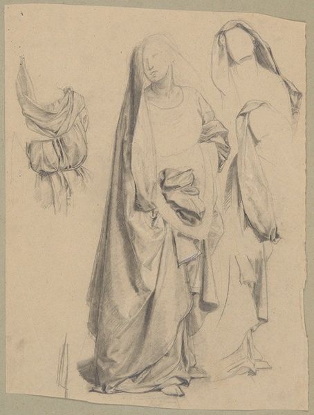 Curator: This is Józef Simmler's 1861 pencil drawing, "Study of the figure of King Sigismund for the painting ‘The Upbringing of Sigismund Augustus.’" Editor: It’s a spectral vision. The lines are so faint, like the king is emerging from a mist. And the color of the paper, a muted green…it’s quite evocative. Curator: Indeed. It provides an interesting glimpse into Simmler’s artistic process. The finished painting was intended to shape a narrative of national identity, showcasing a virtuous upbringing of a future king, but here we see him wrestling with the king’s presence, his form. Editor: I'm struck by the layers of fabrication. First the woven paper, then graphite meticulously applied to mimic textiles and flesh. We see a king represented not by regal pomp, but by the artist’s labor in translating power through material. It reduces royalty to a craft. Curator: I see it as Simmler using historical imagery to construct an idealized vision of Poland’s past, instilling patriotism among a population living under foreign rule. This drawing is not just a material study, but a study of how a ruler’s image can embody national ideals. Editor: But what kind of ‘ideals’ are conveyed through the drape of a robe? Look closely—the rendering is economical, almost mass-produced in its effect, flattening the regal fabric. The very medium—pencil—suggests accessibility and perhaps, a deliberate downplaying of royal extravagance to connect with ordinary viewers. Curator: It's a tension Simmler likely faced: how to depict power in a way that resonates with a society grappling with its own subjugated status. He wants to represent Sigismund with dignity but also approachability. The pencil sketch served a didactic purpose, a vehicle to make history palpable and inspirational for his contemporaries. Editor: Absolutely, and the choice of pencil makes it replicable, able to disseminate this constructed national image through reproductions. Ultimately, this study shows the power of accessible materials in shaping perceptions of power and national identity. Curator: I agree. Looking at the piece again, I am more cognizant of its dual role – the making of a king, and the king’s role in the making of a nation. Editor: A perfect summation. The convergence of labor, material and national consciousness is captivating.