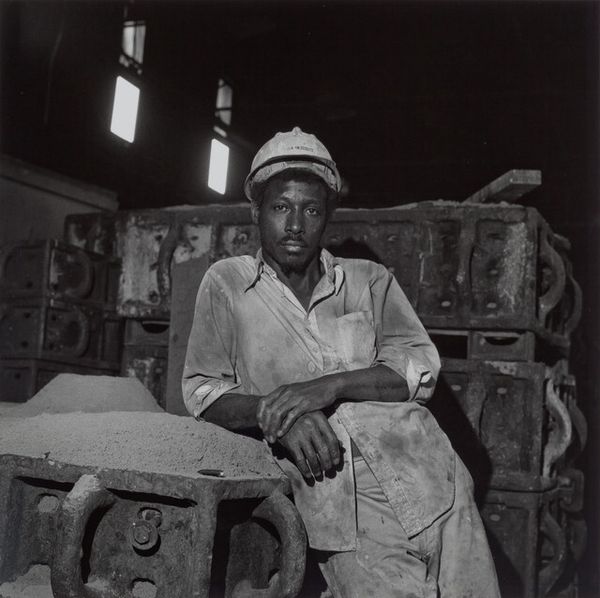 This is a photograph titled, Atlas Steel Casting (Working People series), by Milton Rogovin. The composition immediately draws us into the stark reality of industrial labor. The subject, a steelworker, is centered, his gaze direct and engaging, set against a backdrop of the steel mill. The high contrast between the worker's protective gear and the shadowy interior accentuates his presence and underscores the gritty environment. Rogovin employs a formal approach akin to social realism, capturing the essence of the working class with dignity and respect. The repetitive structural elements in the background, combined with the worker's metallic attire, create a visual rhythm that speaks to the monotony and rigor inherent in his work. The photograph's scale and monochrome palette evoke a sense of timelessness. The structure and tonal range of the photograph invite us to consider themes of labor, identity, and the human condition within industrial spaces. It is an ongoing interpretation of how individuals negotiate their existence within the machinery of industry.