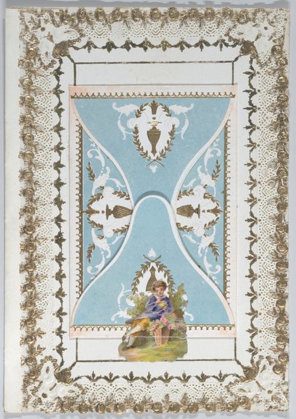 This "Untitled Valentine (Cupid with Garland)", by John Windsor, is a small folded sheet, a delicate artifact crafted from paper. The composition reveals a symmetrical layout, typical of Valentine's cards, featuring a central medallion with Cupid. The artist uses a restricted color palette. Creamy whites and pale yellows contrast with muted browns and the light blue of Cupid’s drapery to evoke a sense of gentle nostalgia. The most striking formal element is the intricate lacework and cutouts, which frame the central image, creating a visual texture that feels like a tangible expression of sentiment. The circular form of the central medallion, echoed in the garland held by Cupid, draws the eye to the heart of the message. The garland itself is a play in the interplay between natural forms and symbolic meaning. The entire work is not just a visual image but a constructed object, engaging with broader cultural codes of love and affection.