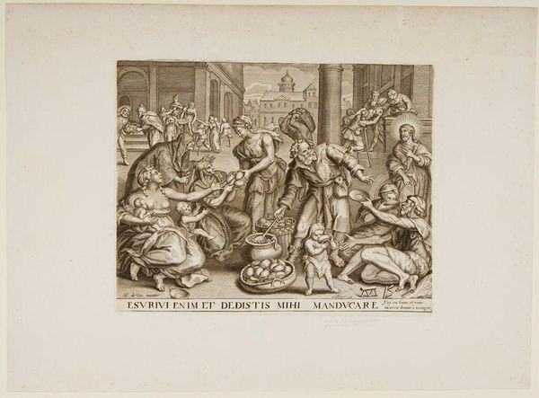 Editor: This plate, "Giving Drink to the Thirsty," by Pieter Nagel, depicts a biblical scene. The composition feels very theatrical, almost like a stage. What is the social commentary here? Curator: It’s interesting that you see a theatrical quality. Nagel is engaging with the public role of religious imagery, particularly how charity was visualized and understood in his time. Editor: So, it’s less about pure religious devotion and more about public performance? Curator: Exactly! Consider how the figures are arranged, almost as if to be witnessed performing these acts. It asks us to think about the politics embedded in such acts of giving. What do you think about that? Editor: It makes me think about the power dynamics at play, like who gets to be the giver and who the receiver, even today. Curator: Precisely. Nagel's work encourages a deeper look into the social and political messages behind acts of charity.