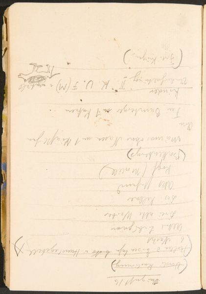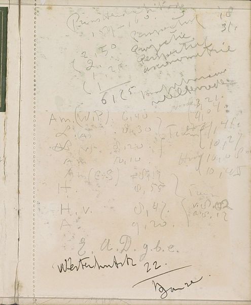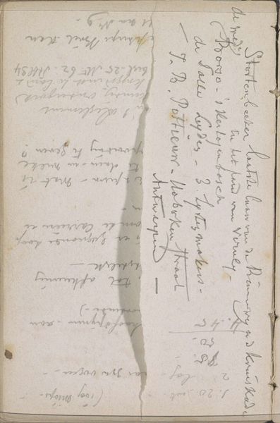 This page of ‘Notities’ was composed by Johannes Tavenraat, a 19th-century Dutch artist, likely as part of a sketchbook or journal. In the Netherlands during this period, there was a growing sense of national identity coupled with economic shifts. The handwritten notes, filled with seemingly random calculations and observations, offer an intimate glimpse into Tavenraat's artistic process. It makes me wonder about how societal changes might influence an artist's perception and documentation of everyday life. The presence of Dutch text also situates the work within a specific cultural and linguistic context, suggesting a connection to local traditions and intellectual circles. The notes aren't organized in a clear or structured way, allowing for a more unfiltered view of the artist's thoughts and artistic preoccupations. We can imagine the artist jotting down ideas amidst a rapidly changing world, reflecting both the mundane and the profound. This personal artifact reminds us that art-making is deeply intertwined with the emotional and intellectual life of the artist, and reflects the broader historical narratives of identity.