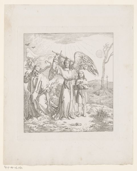 Editor: This etching, "Bakstenen poort in een straat" or "Brick Gate in a Street," by Gijsbertus Johannes Verspuy, probably made sometime between 1833 and 1862, feels quite historical and almost biblical to me. It shows three figures standing in a field, and in the upper left, a cloud filled with cherubic faces peers down. What can you tell me about it? Curator: Well, the religious undertones you pick up on are crucial. The print points to how images circulated and functioned within society. The depiction resembles iconic scenes in biblical history. Consider the tradition of history painting, very much an academic art preoccupation, as evidenced in its figuration. Do you think its distribution was limited to galleries, or would ordinary people see such images? Editor: That's interesting. Given it's a print, I would guess its audience would have been pretty broad and its cost probably low. Was Verspuy trying to make these kinds of historical or biblical stories more accessible to people outside of the wealthy elite? Curator: Exactly. Printmaking served as a powerful tool to disseminate ideas, values, and religious narratives widely. It speaks to how art plays a public role in shaping cultural understanding and social memory. Does understanding that inform your feelings about the work? Editor: It does. I had initially perceived the figures as somewhat isolated, but now I see this print as creating a sense of shared heritage. Were these engravings displayed in homes, or how were they typically engaged with? Curator: These prints were sometimes bound into books, framed and hung on walls as decorations or conversation pieces, or kept in albums for viewing. Disseminating a visual vocabulary. That is the art’s true public and social value. Editor: Thanks! I now see a totally new, important context in the way it connects art and wider society in 19th-century Netherlands. Curator: And for me, that is an excellent reminder of the intersection between artistic interpretation and broad historical awareness.