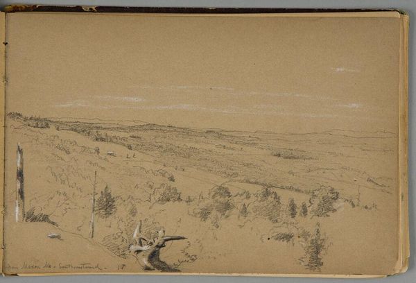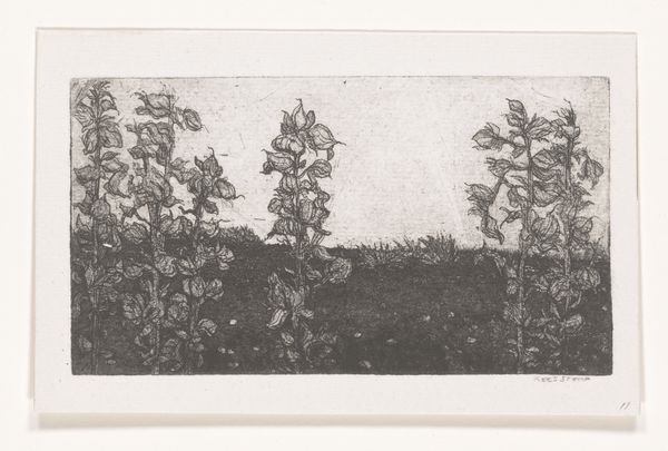 Editor: So, here we have "Veld en bosschage", or "Field and Brushwood," a pencil drawing by Kees Stoop, likely created between 1939 and 2009. There's something almost meditative about it. What do you see in this seemingly simple landscape, beyond the field and the… well, brushwood? Curator: Ah, yes, meditative is a good word! I think Stoop is offering us a slice of the Dutch countryside, not as a grand vista, but as an intimate, almost tactile experience. Look at the density of the pencil strokes. He’s not just drawing grass; he’s creating a feeling of density, of growth, of the very air you might breathe standing in that field. Does that make sense? Editor: Absolutely. It's almost overwhelming in its detail. It feels less like looking *at* a landscape and more like being *inside* one. Was Stoop known for this intense focus on detail? Curator: Indeed. He had a gift for capturing the essence of ordinary scenes with extraordinary precision. He transforms mundane landscapes into emotionally resonant experiences. Notice how the horizon line is almost exactly in the middle of the paper, dividing field and sky into near-equal parts, perhaps suggesting an attempt to achieve equilibrium, but never fully reaching it due to the organic imperfection of the land. What do you make of that? Editor: That imperfect equilibrium you mention adds to the sense of authenticity. It’s not a romanticized vision; it’s a real, lived-in space. I guess the beauty is in the unassuming nature of the subject. Curator: Precisely. And sometimes, the most profound art is found not in dramatic scenes, but in the quiet observation of everyday life. This drawing invites us to slow down, breathe in the landscape, and appreciate the subtle beauty around us. It’s a welcome reminder. Editor: I never thought a simple field could hold so much. This definitely provides food for thought. Thanks!