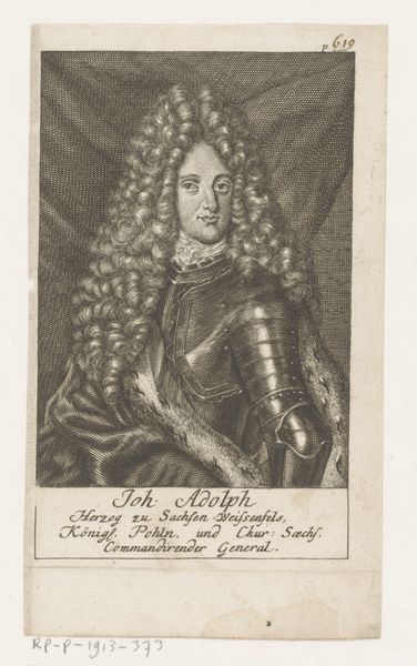 This is Marc Anton Gufer’s portrait of Christian Albrecht von Brandenburg-Ansbach, made as an engraving. This portrait speaks volumes about identity, status, and the performance of power in the late 17th century. Christian Albrecht is adorned in full armor, a symbol of military might, yet his delicate features and elaborate wig hint at the complexities of masculinity during this period. His gaze, both commanding and slightly melancholic, perhaps reflects the burdens of leadership. The choice of engraving as a medium is significant, as it allowed for wider distribution, reinforcing his image and authority across geographical boundaries. Consider how elements of gender and class are interwoven in this piece; the androgynous presentation challenges conventional norms, while the rich attire underscores his aristocratic standing. The portrait invites us to reflect on the multifaceted nature of identity and the ways in which individuals navigate the intersections of gender, power, and representation.