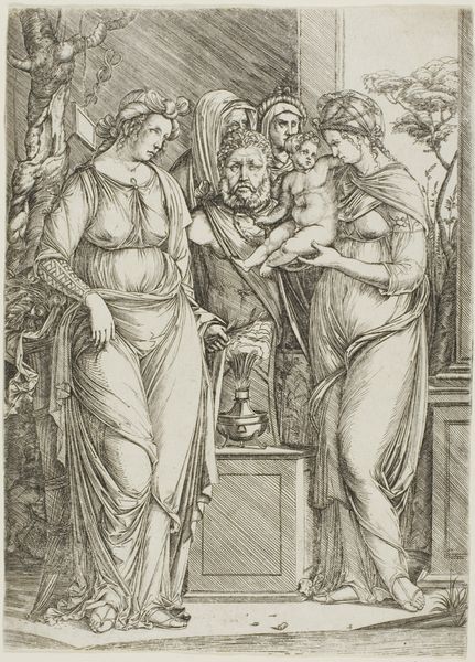 Curator: Here we have "Sacrifice to Priapus- the larger plate" by Jacopo de' Barbari, dating back to around 1499 to 1501. It's an engraving, currently residing here at the Minneapolis Institute of Art. Editor: It’s…striking. The figures almost emerge from the grey background, rendered with such fine lines. They are almost statuesque. Curator: It certainly showcases the burgeoning interest in classical themes during the Italian Renaissance. Notice how Barbari has drawn heavily from ancient sources in his depiction of Priapus, the Greco-Roman god of fertility. And how that plays with notions of power, gender, and the body. Editor: Power dynamics indeed. It makes me consider the physical process; imagine the precise, laborious hand movements needed to create these incredibly detailed lines on the plate. The consumption of images was much slower then, how was the reception different? Curator: It's true that engraving required immense skill and time. These prints weren't mass produced, but how widely distributed were these images within specific social circles, reinforcing the societal norms around fertility, the role of women as maternal figures? It's a question of representation as well as creation. Editor: I keep returning to the stark contrast between light and shadow, especially how the figures stand almost starkly out. One can really sense the physical labor required to produce the copperplate and print. Was de' Barbari himself thinking about the artisan hands when he was creating? Curator: The very nature of printmaking introduces layers of labor: the artist's concept, the engraver's skill, the printer's work. Consider the status of artisans within the Renaissance workshop, who had guild systems influencing production and knowledge transfer. Editor: Yes! So what about this 'Sacrifice', what offering is brought? The print, in and of itself, through materiality, becomes both the object *and* a record. Was the role of de’Barbari similar to a factory owner than conceptual artist, in this sense? Curator: An interesting proposition. We can analyze the print's symbolism, understanding what social rituals were being reproduced and legitimized in 15th-century Italy. But that leads back to thinking about access and power. Editor: Seeing the attention to the textile rendering helps me appreciate not only de' Barbari, but the craftsmen. To think about their skill and work is one approach. Curator: Precisely. Examining this engraving invites us to analyze representation but consider the impact of materials and labor too. Editor: And seeing the confluence of both enriches my appreciation.