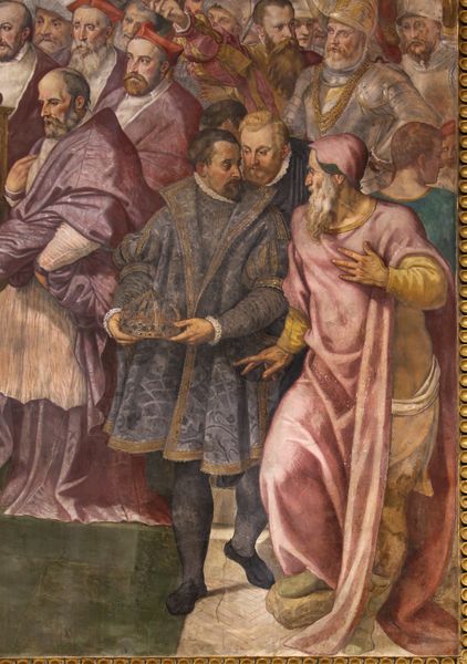 Curator: Let’s discuss Andrea Mantegna's "The Court of the Gonzaga," or rather, a detail from it, created around 1474 using oil paint. What strikes you most when you look at this piece? Editor: Immediately, the almost theatrical staging grabs me. They're not simply posing; they’re presenting themselves, self-aware within this pictorial stage, don't you think? There’s such an elaborate display of wealth. Curator: Absolutely. And consider the materials at play here: oil paint allowed Mantegna to achieve that incredible detail in the fabrics and jewels. Notice how their status isn’t just worn but constructed, reflecting the rising merchant class influencing artistic production and what was being commissioned at the time? Editor: Oh, definitively. It’s about manufacturing an image. That woman seated centrally—so imposing. But, in some ways, so very still, like a mannequin draped in opulent fabrics. I find it eerie. There is something not exactly vibrant here. Curator: True, this stillness, that composure speaks volumes. High Renaissance painting often served as a visual ledger of power, mapping dynastic lines and commercial clout. The detail shown would’ve taken so long to complete that these fabrics or jewelry styles would likely already be out of date or replaced. The actual process speaks volumes, does it not? Editor: Yes, how it makes me wonder, though. What did it feel like to be among all this controlled display? Were these figures merely ornaments of wealth themselves, or was their power also an illusion crafted just like everything else in the room? Curator: Those are interesting questions. And for the family viewing this fresco in their space, this image created what they desired, that perception of the control, right? Editor: Indeed. Ultimately it shows how artists captured an image, of the power the people in charge wanted others to think they held, and were then complicit in conveying a similar image. Curator: A final thought, reflecting on our dialogue. I see how the conditions of this artwork’s creation profoundly shape how it looks and what it represents; from technique, commission and the message displayed in a place for power. Editor: It also tells of the inherent fragility in posing and maintaining such powerful appearances, through not only the image but the work to achieve that illusion too. Food for thought indeed.