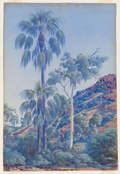 Albert Namatjira's 'Palm Valley, James Range' is a watercolor painting, and it's a lesson in seeing what's already there. The earth tones, those reds and browns, they build up slowly, one wash over another, like the very geology of the place. See how he lets the white of the paper peek through? It’s like sunlight hitting the rocks just so. There is a certain economy to it, a quietness. Look at the way he’s handled the foliage: these tiny flicks and dabs of color that somehow coalesce into bushes and trees. And then there’s that palm, standing tall in the center. It is almost like a sentinel, a witness to the slow, steady work of time. Namatjira’s watercolors bring to mind the work of someone like Agnes Martin, where the act of repetition, of layering, becomes a kind of meditation. With Namatjira, painting becomes a way of paying attention, of honoring a landscape that’s both ancient and ever-changing.