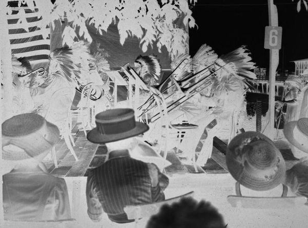 Editor: This is an untitled photograph by C. Bennette Moore, currently held at the Harvard Art Museums. It depicts people clowning around at a party. I am struck by the dynamism of the composition, even in its inverted presentation. What do you see in this piece, considering its formal elements? Curator: The inverted tonal range allows us to focus on the compositional strategies deployed by Moore. Observe the diagonal lines created by the figures' poses. These dynamic vectors establish visual rhythm, intensified by the stark contrasts, creating spatial tension. Editor: So, the formal elements create the energy, regardless of the context? Curator: Precisely. The relationships between light and shadow, form and space, generate the artwork's inherent expressiveness. Editor: That makes the image’s energy even more apparent. Thank you. Curator: Indeed. The artist's control over the formal aspects creates a potent visual experience, something to think about.