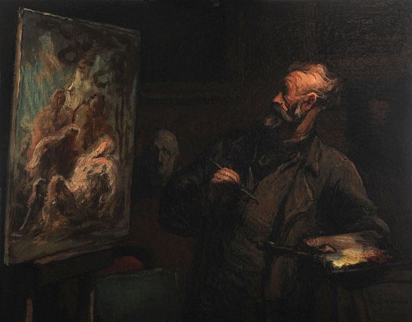 Editor: This is "An Artist showing his Work" by Ernest Meissonier, created around the 19th century using oil paints. There is something so intimate and warm about this painting, despite the somewhat stuffy environment it depicts. What’s your perspective on this work? Curator: This piece speaks to me of artistic lineage, tradition, and the delicate dance of influence. What symbols jump out at you? Consider, for instance, the arrangement of paintings in the background. Editor: Well, they almost look like a family tree… a visual representation of artistic inheritance, maybe? I also see that one figure, presumably the artist, is presenting his work for approval. Curator: Precisely. Note the postures, too. The elder figure seems contemplative, a potential patron perhaps, or even a mentor. His stance communicates a weighty judgment, while the artist offers his work, vulnerable, hopeful. What meaning might be gleaned from the artist's turned back? Editor: It’s almost as if the artist's identity is secondary to the art itself, like he is a conduit for artistic expression, not necessarily the main focus. Curator: Exactly! This image suggests how artistic value transcends the individual, connecting past, present, and future generations. There is power here in the representation of artistic evolution, filtered through personal perception. Does that resonate with your understanding? Editor: Yes, definitely. The painting is not just about these two individuals in that specific moment; it's about the broader narrative of art history. Curator: I concur. I leave this viewing with a renewed understanding of art's purpose as a living, breathing legacy. Editor: I now understand how much richer an artwork can become when viewed as part of a larger historical narrative. Thank you.