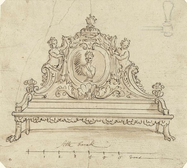 Editor: Here we have Jean-Jacques Feuchère’s "Design for a Pendulum Clock," a pencil drawing dating back to the 1830s or 40s. There's such an elaborate level of detail, and the drawing style feels classical, but somehow also evokes a sense of personal artistry because it’s on toned paper. What can you tell me about this kind of object, given its context? Curator: It's fascinating how designs like this reflect the shifting power dynamics of the era. The pendulum clock, initially a symbol of scientific precision for the elite, gradually permeated bourgeois society. So, in seeing something so elaborate like this, do you think this design aims for functionality or something more? Editor: Definitely more. All the embellishments feel almost excessive for a functional object. Perhaps it speaks to aspiration, status... Curator: Precisely. Consider the rise of industrialization and the burgeoning middle class. Owning such an ornate clock was less about telling time, and more about displaying wealth and aligning oneself with aristocratic taste. This drawing also suggests something about art education - where do you think an artist like Feuchère learned the craft needed to render ornament in this manner? Editor: Probably at the Beaux-Arts. There is almost a uniform quality in architectural drawings around the turn of the century...It reminds me of how, with photography, a person with no artistic skill could represent themselves in an aesthetic, "fine art" form... This would almost let a middle-class family "stage" or perform an aristocratic status... Curator: Exactly, these institutions both supported, and enforced, cultural and class boundaries. Editor: It's amazing to consider this pendulum clock, not just as an object, but as a piece of social commentary rendered in graphite. Curator: Indeed, a reminder that even in design, there's always a deeper cultural narrative ticking away.