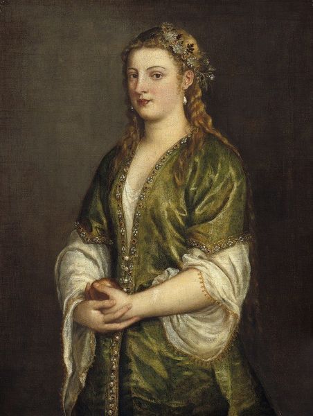 Curator: What a piece, I'm honestly drawn in by the color play first, that dramatic ochre and blood red. Makes you almost miss what’s being presented to you. Editor: You’ve intuited that perfectly! What we're seeing is Titian's "Judith and Her Maidservant with the Head of Holofernes," likely from around 1570. Curator: Right, and immediately I want to think about where the pigment comes from – all the techniques around this time relied on the artist grinding minerals, plants even insects into oil! It brings so much history into that brush stroke. Editor: Absolutely, understanding the material history is crucial. Look at the contrast here; the delicacy of Judith's gown versus the coarseness implied in the beheading of Holofernes. There is a dichotomy. Curator: Totally! Almost a contradiction–but do you find this representation of Judith disturbing? Is it empowering? Is she just cleaning up for everyone, or profiting from war, literally? Editor: That’s precisely what makes it captivating! The details really draw you in too: pearls, jewels, the slightly damp-seeming fabric. But the *doing*, the act that she’s doing, you know, with help... it hits at some deeper social currents I would love to better appreciate. The context would fill in that narrative in a profound way. Curator: Indeed. Venetian society and painting from this era were intensely tied, in part through commissions. Even Titian relied on noble patrons whose needs shaped the final products that came from the artist’s hand. You also see the influence of Mannerism coming into the picture too, and with it a certain theatricality is brought into these narrative scenes. Editor: You know what is really sticking with me? It's those details. It takes true craftsmanship to capture, not only form but feel through paint alone, like the weight of drapery, the tension between serenity and grim duty. Art of that time asked people to really *believe*, which is what really gives art of the old masters the aura and intensity we know to associate with it. Curator: So in the end, what's left to do besides tip one’s hat to how interwoven this all is, isn’t it? I will be thinking about this one for a good while yet. Editor: Indeed.