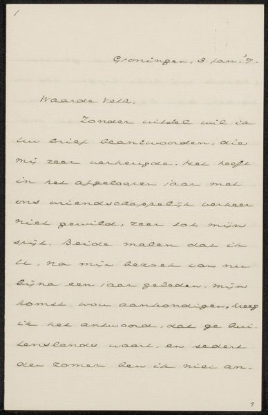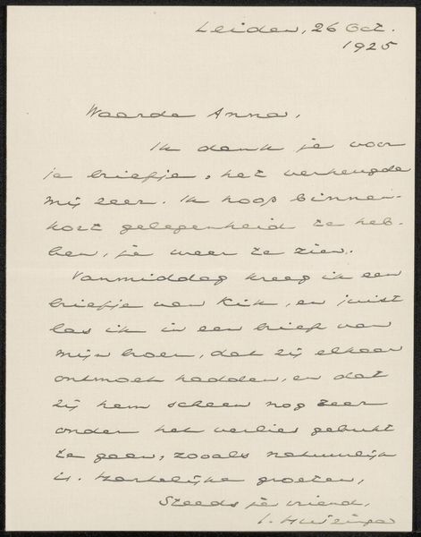 This letter was written in 1927 by Johan Huizinga, using ink on paper. The handwriting gives the impression of being both careful and casual, if that makes sense? You can see the process of Huizinga’s thoughts right there on the page, almost as if he’s thinking out loud. The ink is a dark, solid colour, giving a sense of permanence and formality. But, the lines are thin, with a delicate texture, so it feels quite approachable. See how the letters lean and loop, with a rhythm that’s really unique to the individual hand that wrote it? It's like a fingerprint, you know? The way the words are placed on the page tells you that this isn’t a final draft, but more of a note, perhaps even a reminder. It's kind of like Cy Twombly's work in that way, the way Twombly made marks that are both expressive and communicative. In both, you get a real sense of the person behind the art. It reminds you that art is just communication between people.