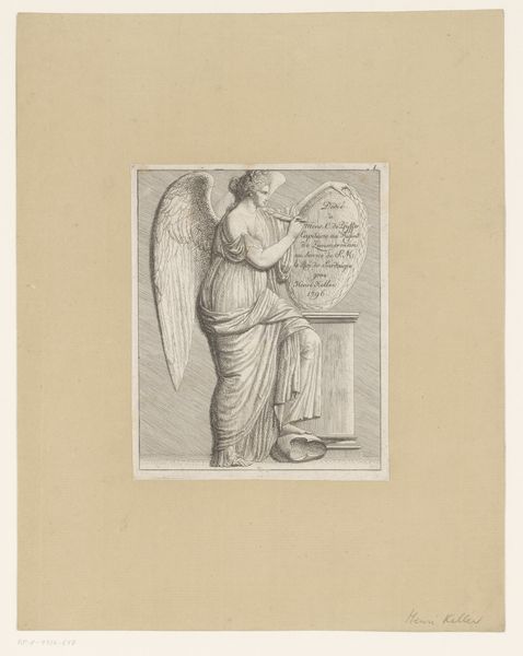 Editor: This is Thomas Byrne's "Iron Doorway to Tomb" from around 1936, rendered in a drawing. It's striking how classical the figures on the door are, almost like a Roman relief. What do you see in this piece beyond the immediate impression? Curator: It’s fascinating how Byrne intertwines the classical with the funereal, isn't it? Beyond the academic style and the representation of what appears to be metalwork, consider the context. The 1930s were marked by global upheaval, the rise of totalitarian regimes, and anxieties about mortality on a mass scale. How might this doorway, with its figures potentially representing angels, speak to those fears and the desire for transcendence? Editor: So, it's not just a decorative doorway but a reflection of the era’s anxieties? Curator: Precisely. The medium, a drawing of a metal door leading to a tomb, carries weight. Metal implies strength, permanence, while a tomb signifies the ultimate end. But Byrne complicates this with the presence of what looks like a comforting guardian angel. Consider how the figure defies rigid categorizations – challenging simplistic notions of salvation and inviting reflections on resistance against despair in oppressive conditions. It could suggest hope or solace. How do you think the academic style enhances or detracts from this message? Editor: I see what you mean! The style almost gives it a sense of timelessness. It could be read as something current, or historical. I hadn't thought about the political or cultural subtext until now. Thanks! Curator: It's through these layered interpretations that we engage with the art and consider its enduring relevance. Seeing it this way definitely complicates it beyond the straightforward and aesthetic appreciation. It leaves one to ask what message the creator sought to deliver.