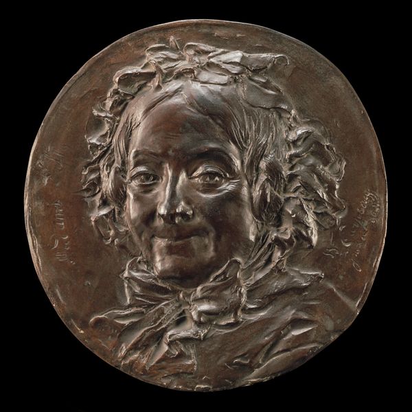 Curator: What a striking portrait! Antoine Louis Barye rendered this image of "Emile Diaz, Son of the Painter" sometime between 1850 and 1875. It’s a bronze relief, currently residing at The Art Institute of Chicago. What's your immediate reaction? Editor: Brooding. Absolutely brooding! It has such a weighty presence. Is it the patinated bronze or the somber profile of young Emile? I also love how the sitter is presented in the roundel form! There is almost something timeless and modern in its rendering, even as its artistic roots are very traditional. Curator: Barye was known for his animal sculptures, but this piece suggests a sensitive exploration of human character, wouldn't you agree? The almost classical profile contrasts interestingly with what feels like an emerging naturalism. It has that romantic longing—you know, the kind that just makes your chest ache a little. Editor: Absolutely! This echoes a powerful romanticism. I think this hints at larger power dynamics, though. I'm particularly interested in the piece in its engagement with societal structures of the 19th century. Portraiture was not just about likeness; it signified social standing, legacy. Placing "son of the painter" on the medallion tells me something of importance was being conveyed by presenting Emile this way, even within artistic circles. Curator: Yes, there’s a fascinating interplay between individual identity and social identity on display here! The decision to explicitly identify Emile through his lineage – an artistic lineage at that - speaks volumes. Editor: Right. We could analyze the gaze of the young Emile, of course, and see if we discern something deeper in his inner world, his subjectivity, as it were. I see a child situated and burdened, however gloriously, by what’s come before him. And then I begin to question the politics of the portrayal itself! Curator: So you feel he's under pressure in this depiction? A fascinating read! To me, this bronze roundel offers a quietly profound and lingering intimacy that draws you back to it, again and again. Editor: I think we have an interesting clash between that which feels and is indeed sentimental, and that which also reflects and embodies structures of artistic power. The dialogue is, at times, very subtle, and in other places is deeply revealing! Thank you for drawing attention to this amazing piece!