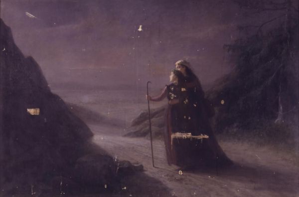 Curator: We’re looking at "Petrarch at the Spring of Vaucluse," an oil painting created in 1867 by the Swiss artist Arnold Böcklin. Editor: My first thought is how dark the painting is, the somber tonality really amplifies the solitude of the figure. Is it meant to feel so melancholic? Curator: It’s interesting that you hone in on that emotional reading immediately. Observe how Böcklin employs contrasting textures: the smooth surface of the figure's robes juxtaposed against the rugged underpainting of the rocks and vegetation. This dichotomy creates visual tension, framing Petrarch as a distinct subject from his environment. Editor: And what an environment. Vaucluse carries significant symbolic weight, of course. This spring was famously the site of Petrarch’s deep, unrequited love for Laura, the woman who inspired his most famous sonnets. The shadowy grotto hints at the hidden depths of longing and unfulfilled desire. Curator: Absolutely. Moreover, Böcklin uses a tight tonal range to subdue colour, placing emphasis on form and chiaroscuro effects. This technique concentrates the viewer's focus on the interplay between light and shadow. Petrarch’s form is caught between the darkness of the cave and a softer light in the distance. Editor: You’re right. And beyond just the literal place, water imagery is very prevalent here as a symbol. Springs often represented renewal, purity, but here the obscured setting imbues it with uncertainty and perhaps a hint of danger? It almost mirrors Petrarch's own ambivalence, suspended between poetic inspiration and unattainable love. Curator: Consider the gestural brushstrokes defining the landscape. It lends dynamism but also ambiguity. This approach mirrors Böcklin’s broader aesthetic, one which departs from academic realism toward more subjectively constructed visual worlds. Editor: For me, thinking about Petrarch—this place distills a core human experience. It becomes a symbol not just for Petrarch's sorrow but a broader narrative of the pain inherent in artistic inspiration, constantly haunted by what we can never fully grasp. Curator: Precisely. Analyzing the art formally and examining its symbolic construction provide mutually enhancing perspectives, drawing the viewer more deeply into the work’s nuanced dialogue between artistic form and universal themes. Editor: Böcklin's Petrarch leaves one to consider not just what is seen but also what remains just beyond our reach.
