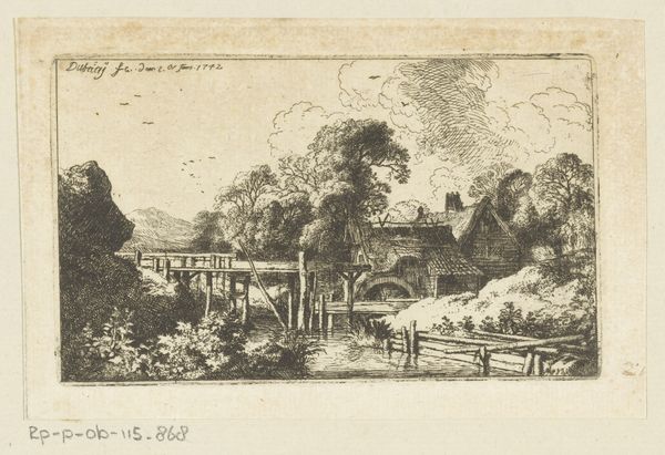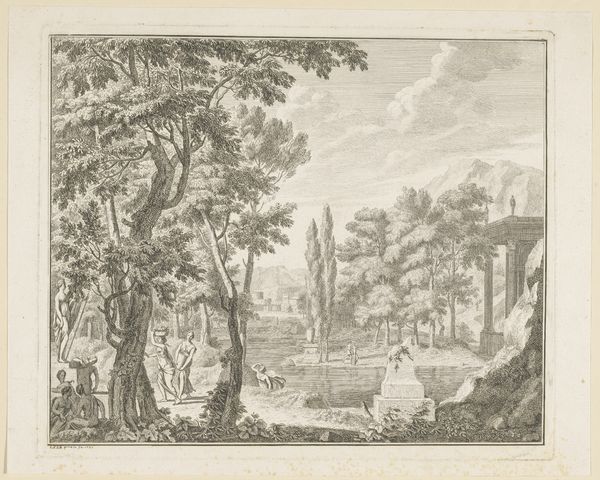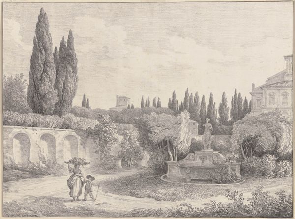 Editor: So, this is "View of the entrance to Tivoli and the walls of the Villa d'Este" created between 1727 and 1791, by Jean Claude Richard, Abbé de Saint-Non. It’s a pen and ink drawing, etched. There's almost a dreamy, romantic quality to the Italian landscape, but it’s rendered with such precise lines. What draws your eye in this piece? Curator: I see a conscious effort to frame a specific kind of experience. The Villa d’Este, renowned for its elaborate gardens and water features, was a destination for the elite on the Grand Tour. Consider how Saint-Non presents it. It's not just a depiction of a beautiful place; it's a representation of a culturally sanctioned journey and the consumption of art and history by a privileged class. How might the accessibility of this print influence perceptions of the actual site? Editor: I hadn't thought about the consumption aspect so directly. So the print, by being easily reproducible, brings this elite experience to a wider audience, even if that audience is still relatively privileged? Curator: Precisely. Etchings like this served as souvenirs, reminders of cultural capital acquired through travel. The act of possessing and displaying such prints reinforced social standing and demonstrated an individual’s participation in a specific cultural narrative. Notice how the horsemen at the bottom are not engaging with this elaborate water infrastructure, perhaps they represent the natural counterpart to the artifice of the villa, meant to enhance the grandeur? Editor: That's a great point about the horsemen – their placement and activity adds another layer of meaning I had overlooked! I'm beginning to see how this image isn't just about aesthetic beauty; it's communicating a very specific message about culture, class, and the Grand Tour experience. Curator: It's about understanding the visual vocabulary of its time and its role in shaping societal perceptions. Always look for those clues about social role and perception. Editor: I definitely will. Thanks, that was super helpful!