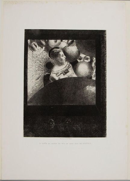 Curator: It's really quite striking, isn't it? This is Odilon Redon's "At the Horizon, the Angel of Assurance and in the Somber Sky a Questioning Look," currently residing at the Harvard Art Museums. Editor: The dreamlike imagery certainly captures the anxieties of its time. The child angel, the floating eyeball, the ominous darkness—it feels like a premonition of the horrors of the 20th century. Curator: Redon worked during a period of intense social and political upheaval, and his work reflects anxieties around the shifting power structures and the questioning of traditional authority. Editor: The gaze of that eyeball really puts you on edge, doesn't it? Are we meant to see it as benevolent or sinister? It certainly challenges the conventions of traditional religious iconography. Curator: Exactly! Redon's symbolism offers a critique of power dynamics, questioning who watches whom, and who holds the power to judge. It invites us to consider our own roles in the gaze. Editor: Thinking about the artwork's context, it's a potent reminder of the importance of challenging oppressive structures and refusing to accept dogma. Curator: Precisely. It remains a work that resonates with contemporary audiences grappling with similar power imbalances and societal anxieties.