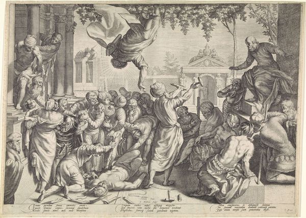 Cornelis Galle I created this engraving, “Gevaren van het proces,” sometime between 1600 and 1650, during the Dutch Golden Age. It depicts a central female figure, likely representing Justice or Truth, forced to navigate a gauntlet of spears. The image is rich with cultural references, reflecting the social and political climate of the time. The spears represent the dangers and challenges of legal processes, while the figure of Justice suggests the potential for corruption and the difficulty of achieving fairness. Galle's work speaks to anxieties about the legal system and the importance of ethical conduct among those in power. As historians, we can delve into legal and political texts from the period, as well as look at pamphlets and other popular imagery, to better understand the ways in which legal institutions were perceived. By analyzing these sources, we can better understand the social context of Galle’s work and the powerful role of art in commenting on the institutions of its time.