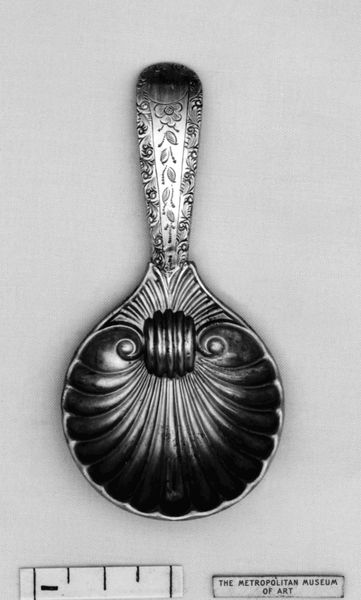 Curator: Let's discuss this intriguing silver object from The Met's collection. It's a caddy spoon, crafted by Thos. Newbold, sometime between 1826 and 1827. Editor: My first impression is of remarkable restraint; the elegant, slender handle giving way to that geometric bowl resembling a stylized shell. There's a curious balance between function and understated beauty. Curator: Indeed. The Georgian era, from which this originates, was seeing the proliferation of tea drinking as a social ritual. These spoons were specifically designed for measuring and dispensing tea from caddies. Their design reflects a certain socio-economic reality: tea as a precious commodity. Editor: That certainly places the spoon into a narrative of colonialism and trade. Considering the form, one can consider the play of light on its surface, those fluted details drawing the eye. There is this almost severe simplicity that prevents it from being ostentatious despite its precious material. Curator: Precisely, that tension is critical. While silver denoted a degree of affluence, the controlled design indicates evolving aesthetic tastes. Think of it in contrast to some of the more baroque silverware of previous eras; this whispers wealth rather than shouts it. The presence of monogram on the handle indicates a personal item meant for domestic, rather than public use. Editor: The choice of a stylized shell also lends itself to symbolic interpretation, suggesting luxury or trade with faraway locations; a fitting form considering its utility. And this is how the artwork contributes, reinforcing notions of trade and elegance. Curator: Yes, and one can read into its very shape—its ergonomic efficiency alongside that decorative element. It's a prime example of how functional objects became carriers of symbolic and social significance. Editor: On reflection, seeing it merely as an object used for tea underestimates how much it actually carries, socially. It really encapsulates luxury, domesticity, and societal rituals within a single, beautifully formed item. Curator: And ultimately a testament to the quiet but complex elegance of Georgian design.