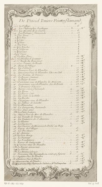 Editor: This etching from 1775 presents as a kind of catalog, "Inhoudsopgave in ornamentale lijst van de verzamelde werken van Giovanni Battista, Giovanni Domenico en Lorenzo Baldissera Tiepolo." It's essentially a beautifully framed list, seemingly of artworks. I am interested to know how we might interpret its cultural value, particularly its place in art history. Curator: This work really speaks to the burgeoning art market of the late 18th century. The Tiepolos, already famous, are presented here not just as artists but as brands. Editor: Brands? Curator: Precisely. The ornate frame and formal listing elevate what would be a simple inventory into something more like a promotional document. This suggests a growing awareness of the artist's market value, but how do you think this kind of listing shapes the perception of the artworks themselves? Does it help or hinder artistic appreciation, you think? Editor: That’s a great question. I suppose it risks reducing complex artworks to mere commodities or entries on a list, losing sight of the artistry. On the other hand, it makes the work more accessible. Curator: Exactly! It democratizes access. What about the use of "ornamental lijst?" How does the visual style itself, the Baroque flourishes and the meticulous lettering, influence its meaning as a document of cultural record? Editor: The baroque details suggest a reverence for tradition while simultaneously advertising the innovation within that tradition through this record. I never really considered the promotional side of art from this period. Curator: Precisely! And isn't it fascinating to see how artists even then were so actively involved in managing their public image? Editor: Absolutely. This has opened my eyes to considering promotional art. Curator: Wonderful! I've seen new perspectives myself.