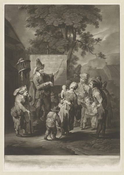 Editor: Here we have "Ontvangst van een nieuw lid van de Bentvueghels," from around 1700, by Matthijs Pool. It's an engraving, so lots of fine lines and details. It feels very theatrical; almost like a stage scene with all these figures arranged in such a deliberate way. What structural choices stand out to you? Curator: Indeed, the print functions much like a stage. The artist employs a distinct foreground, middle ground, and background, creating spatial depth. Note how the central grouping of figures, bathed in light, draws the eye immediately. Can you discern how line quality contributes to the visual hierarchy? Editor: I see how the darker, bolder lines emphasize the figures at the front and draw our attention to the initiate being crowned with leaves, almost directing our focus. Is that intentional? Curator: Precisely. Observe the strategic deployment of hatching and cross-hatching. These linear patterns generate tonal contrast, enhancing the illusion of three-dimensionality and, more critically, guiding the viewer's gaze to the central figures in a precise, almost mathematical way. The light seems strategically deployed to guide our focus, no? Editor: Absolutely, it seems to bounce off the main figures! The balance between light and dark creates depth but it’s a calculated drama. It really guides our understanding and where we look. I see that now! Curator: Correct! It illustrates that form and structure work together, allowing the themes to surface through our own, intentional decoding of their meanings. This allows a complex engagement within its linear parameters. Editor: That’s insightful! I’ll pay closer attention to form and light now when considering narrative artworks!