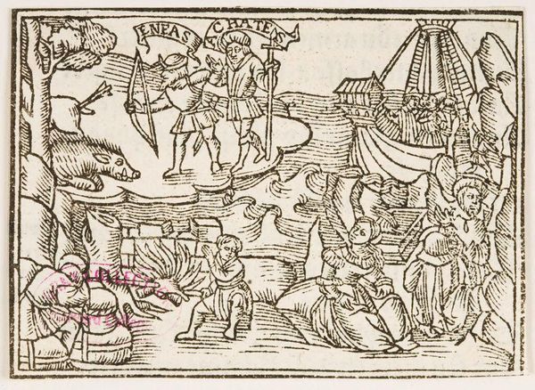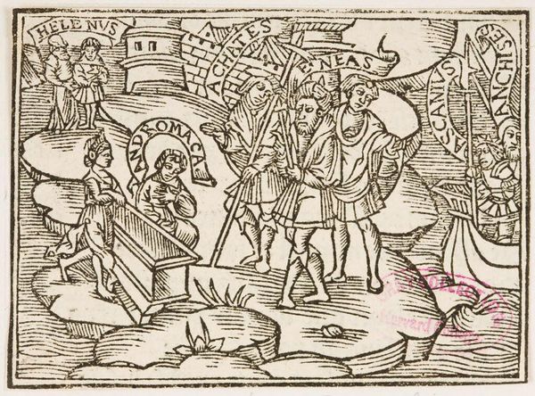 Curator: Illustration XLVII is an intriguing, undated piece from an anonymous artist, currently housed in the Harvard Art Museums. The stark black and white contrast gives it a dramatic quality. Editor: Immediately, I'm struck by the dense composition. The figures are embedded within the architectural forms, creating a powerful sense of confinement or perhaps integration with the city itself. Curator: It's likely meant to depict a scene from classical literature, possibly Virgil's Aeneid given the labeling "ENEAS" next to the character resting on a bed. Woodcuts like this often served to illustrate printed books and disseminate classical stories to a wider audience. Editor: The linear quality of the woodcut—the parallel hatching, the sharp angles—contributes to a frenetic energy. There is also a play between the solidity of the built environment and the more fluid, dynamic rendering of the figures. Curator: Right. This was a period of growing literacy and the increasing use of printed images in shaping public perception. Editor: Ultimately, the tension of line and form, figure and ground, renders a potent vision. Curator: I agree. It speaks to the evolving role of art in disseminating knowledge.