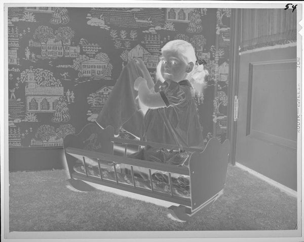 Editor: This photograph, "Untitled (girl putting doll into cradle)" by Lucian and Mary Brown, shows a child gently placing a doll in a cradle. The scene feels so tender and intimate. What do you see in this image? Curator: It’s funny, isn’t it? How even in a simple scene like this, we find echoes of larger human dramas. I see not just a child playing, but a tiny universe of care, responsibility, and imitation unfolding. The wallpaper's quaintness is just a backdrop to a monumental event: the transfer of nurturing! Editor: That's a beautiful way to put it. I hadn't considered it as such a significant act. Curator: Art has a funny way of doing that, doesn’t it? Enlarging the everyday until it holds the cosmos. Editor: Definitely! This makes me see the picture with fresh eyes.