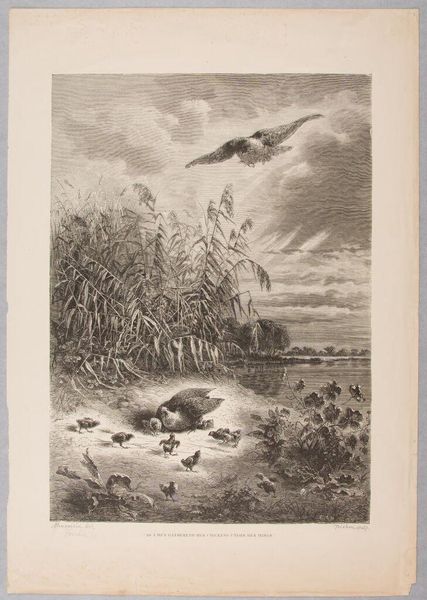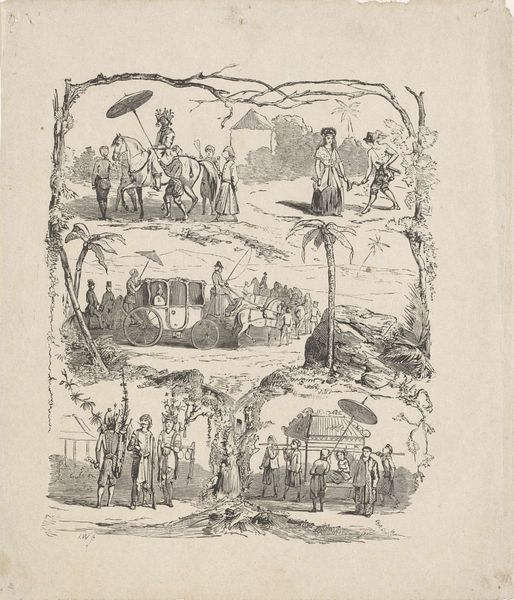 Editor: So, this is Honoré Daumier’s "A Husband Burns with the Fires of Jealousy." It’s quite a darkly comic image, isn’t it? I’m struck by the stark contrast between the figures in the water and the couple on the hill. What do you make of this scene? Curator: It's Daumier at his satirical best! To me, the husband literally drowning in his jealousy is a brilliant visual metaphor. The embracing couple, oblivious on their little hill, are blissfully unaware of the turmoil below. It’s almost as if Daumier is asking us, "Isn’t jealousy a ridiculous waste of energy?" What do you think? Editor: I hadn’t thought of it that way, but it really does seem to mock the husband's suffering. Thanks! Curator: Of course! Always a pleasure to wade into Daumier’s swamp of human foibles.