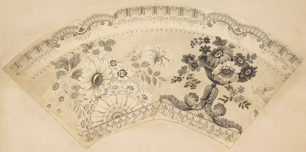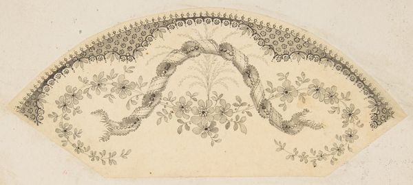 Editor: Here we have an interesting study, called "Lace Design", created by an anonymous artist in the 19th century, utilizing a mix of pen, pencil, ink, and etching techniques on paper. It has a delicate, almost ethereal feel to it. I’m curious, what's your initial impression? Curator: It whispers of bygone eras, doesn’t it? It’s a fragment of a fan design, I suspect, brimming with floral arrangements trapped in suspended animation. Do you notice how the pen work outlines these gorgeous blooms, but with a gentle touch? It is a soft exploration, capturing the essence rather than striving for strict photographic accuracy. What purpose does that inform, do you think? Editor: Maybe to focus on the artistic vision instead of being confined by reality? It also makes it more decorative, fitting for "decorative art." How does this fit into the artistic context of the 19th century? Curator: The 19th century, honey, was mad for details! Intricate patterns bloomed in wallpapers, textiles, even architecture. Here, someone is contemplating form. This study lets us glimpse into their creative thinking—the quiet, lovely calculations involved in creating something beautiful. It's kind of special, like holding someone's diary of sketches. A look behind the final product! Does this make you want to add lace to everything? Editor: Absolutely! I'm seeing it everywhere now. Thinking about how simple sketches informed entire eras of decorative design makes me appreciate all those little details. Curator: Yes! It is so tempting, no? Maybe a lovely little lace trim for the old backpack? Editor: (laughs) Exactly! Well, thanks for bringing new vision into this, professor, you're like some kind of design prophet!