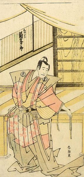 Editor: Here's a woodblock print called "Woman and Child Bidding Man Farewell" by Kitao Shigemasa. It’s striking how vertical it is! What first catches your eye about this piece? Curator: Well, it's that bittersweet scene, isn't it? That melancholic ache of departure, rendered with such delicate lines. It’s more than just a farewell; it’s a quiet drama, a poem of everyday life. Do you feel the restraint in the figures' postures? Editor: Absolutely, there's a stillness to it. It almost feels like a captured breath before a long journey. Curator: Precisely! Shigemasa captures that poignant moment where private emotions meet the vast, indifferent world outside. A subtle yet powerful meditation on connection and separation, wouldn't you agree? Editor: I do. It's amazing how much emotion can be conveyed with so few lines. I’ll definitely remember that, thank you!