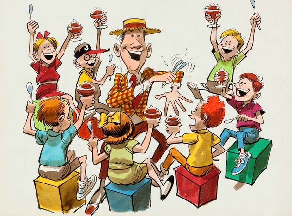 This is Jack Davis’s caricature drawing *TV Game Show*. Though undated, the image likely captures the golden era of the genre in the late 20th century. Davis, who was white, found his niche in popular culture, working for magazines like *Mad*. Here, he zeroes in on television's fascination with game shows, which often celebrated ordinary individuals in pursuit of extraordinary prizes. The composition is filled with exaggerated figures; a beaming host hands out money while a female contestant celebrates her win, surrounded by an excited audience. The artwork prompts us to consider the role of television in shaping societal values and aspirations. Are these shows an innocent form of entertainment, or do they perpetuate an obsession with wealth? Davis's caricature captures the emotional intensity and sometimes absurd nature of these televised spectacles, reflecting our complex relationship with fame and fortune.