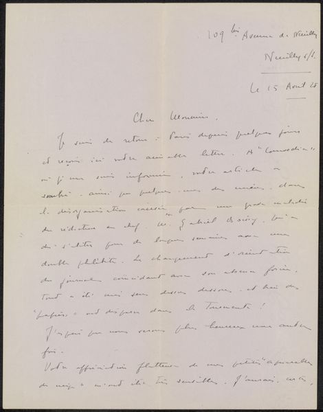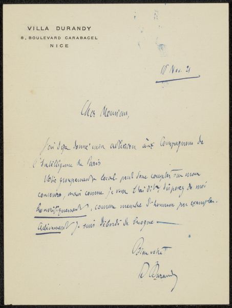 Curator: Looking at "Brief aan jonkheer Hendrik Teding van Berkhout", dating possibly to 1932, an ink drawing on paper now held at the Rijksmuseum, I’m immediately drawn into the elegance of its calligraphic form. What are your first impressions? Editor: It feels surprisingly intimate, despite being a formal letter. There's a delicacy to the lines, a rhythm like music on the page. I can almost hear the scratching of the pen. Does it strike you the same way? Curator: Precisely! A.J. van 't Hoff clearly intended for this letter to transcend mere correspondence. It merges the practical with the aesthetic, reflective of Modernist principles, transforming everyday communication into art. What I'd love to understand is the effect of these kind of approaches on society and imagery! Editor: You know, it makes me consider the audience—Jonkheer Hendrik Teding van Berkhout. Imagine receiving this. Would its artistic merit overshadow the message? Would it enhance his perception of the sender? It’s more than a missive; it's an act of cultivated self-presentation, what I'd like to think it suggests. Curator: Ah, absolutely! I agree. It becomes a statement, subtly communicating about the writer's sensibilities and cultural standing, blurring the lines between public and private personas in this specific moment in art history and culture. Editor: Yes, it also makes you consider accessibility to art outside the establishment. This shows that anyone, anywhere, could embed meaning and intention through this kind of approach. Do you see other potential readings we might draw? Curator: Well, it prompts consideration of handwriting as an inherently artistic act, one influenced by socio-economic class and artistic trend. Today, in a digital world, it feels almost… nostalgic. But that’s its beauty; a fragile dance across time that beckons conversation. Editor: True. It becomes more about personal history than simple communication. Looking back, the letter transcends a commercial and private function. I leave feeling like the gesture of writing and calligraphy elevates its purpose to that of an art object in its own right.