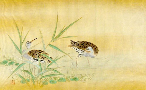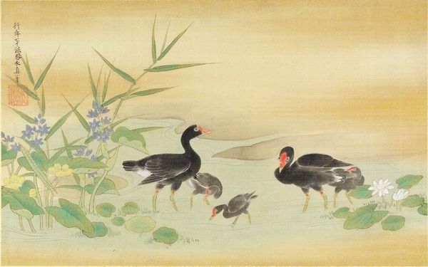 Editor: This is "Peacocks and Peony" by Kano Yasunobu, created sometime between 1614 and 1685. It’s a lovely, small painting and the peacocks seem so gentle. How do you interpret this work? Curator: Considering Yasunobu's position within the Kano school, these peacocks might symbolize power and status, reflecting the social hierarchies of the Edo period. Peonies, in turn, can represent wealth and prosperity. How might this combination speak to the visual language of class? Editor: So it's not just a pretty picture, but a statement about social standing? I hadn’t considered that. Curator: Exactly. It invites us to think about art’s role in reinforcing, or perhaps even subtly critiquing, the established order. I think it's fascinating how art can embody both beauty and social commentary. Editor: That's something I'll definitely keep in mind moving forward.