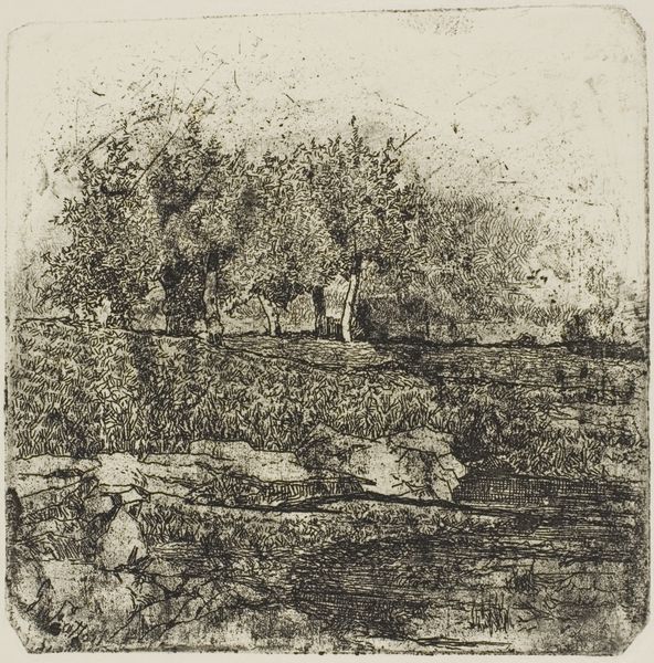 Charles Jacque created this etching titled, "In the Forest," with a plate measuring 85 by 121 millimeters. The dense network of lines creates a seemingly impenetrable view into a dark forest. Jacque’s composition emphasizes a limited tonal range with the delicate network of etched lines which define the trees, foliage and the ground. The interplay of light and shadow, achieved through varying densities of line, creates an immersive atmospheric depth. The formal elements like the stark contrast of light and dark, and the intricate detailing, evoke a sense of mystery and the sublime, drawing viewers into a space where nature's raw power is palpable. This dense structure destabilizes traditional notions of landscape. It challenges our perception by creating a space where clarity and ambiguity coexist. The forest becomes a metaphor for the unknown, inviting introspection on our place within the natural order. The visual structure invites an ongoing dialogue about nature, perception, and representation.