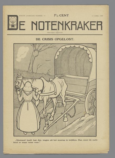 This is a cover of De Notenkraker from October 5th, 1907, made with ink on paper by Albert Hahn. It’s got this stark black and white palette, all sharp lines and cross-hatching. It’s not trying to hide the process, you see every stroke. The focus is on this family, and what strikes me is how Hahn uses the lines to create such distinct characters. Look at the mother's face. It's like a mask of discontent, achieved with these quick, almost frantic lines. The father seems preoccupied, holding a child in one arm and pushing a stroller, his expression hidden by the shadow of his hat. The whole composition feels like a loaded question about social roles and family dynamics. Hahn’s stark style reminds me a bit of Käthe Kollwitz, both in their directness and their willingness to confront uncomfortable truths about society. Ultimately, this piece is a reminder that art doesn't always need to be pretty. It can be a mirror reflecting the messy, complicated aspects of life.