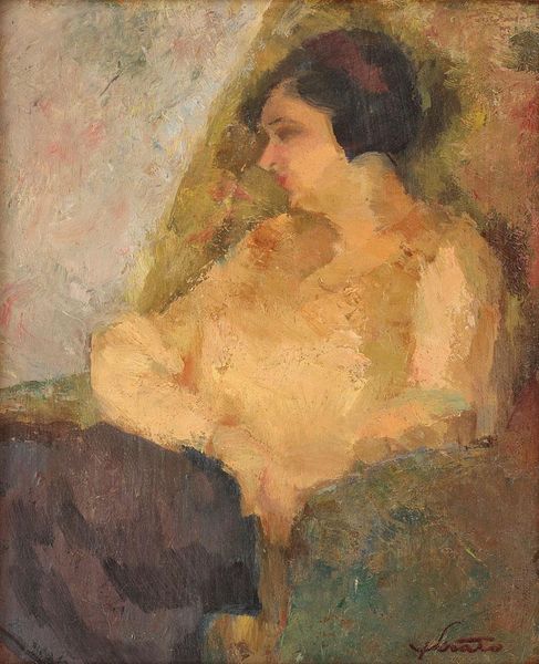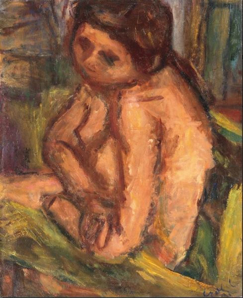 Curator: Standing here before "Seated Nude," created in 1913 by Edvard Munch, one can’t help but feel the… fragility. Editor: Fragility? It hits me as something almost feral, unvarnished. Those wide eyes—like a startled deer, but also… knowing? The brushstrokes, heavy and raw, give it a brutal honesty. Curator: Absolutely. Munch's hand is very present. And yet, her posture, the way she almost curls inward, makes me think of a protective vulnerability. Notice the subtle blush of color; is she ashamed or simply…exposed? There's such quiet melancholy. It asks a lot from the viewer. Editor: The cultural echoes are fascinating, too. Long braids—often a sign of modesty, a held-back sensuality, at the time—frame that arresting gaze. The pale window almost mocks her confinement in that gilded amber setting. And she appears to be cradling something in her hands? It makes me think about forbidden love in a new light. Curator: Possibly herself or a cherished item...It's Munch, so undoubtedly complicated. His obsession with the self is here; it mirrors back his turmoil through her and evokes feelings in each person very acutely. It feels almost confessional. It invites questions: is this about the suppression of his love life? Editor: Confessional, yes, in a way only Expressionism can be. The symbols bleed through: The hair as power? The nude body an objectification by him for the viewer? It feels caught between the domestic sphere, which is golden, and the emotional life as seen from that window of ice. Curator: It makes me reflect on the universal struggle between concealment and exposure, perhaps especially poignant for Munch. Editor: Exactly, and for ourselves as well! Looking at it from my perspective—and yours, truly—it gives you permission to own your complexities, as a woman. "Seated Nude" transcends its subject, speaking directly to that push and pull within us all. It almost normalizes all those complicated feelings! Curator: A brutally beautiful acceptance, rendered in thick paint. Munch's nudes invite more empathy rather than the intended male gaze. A new view!