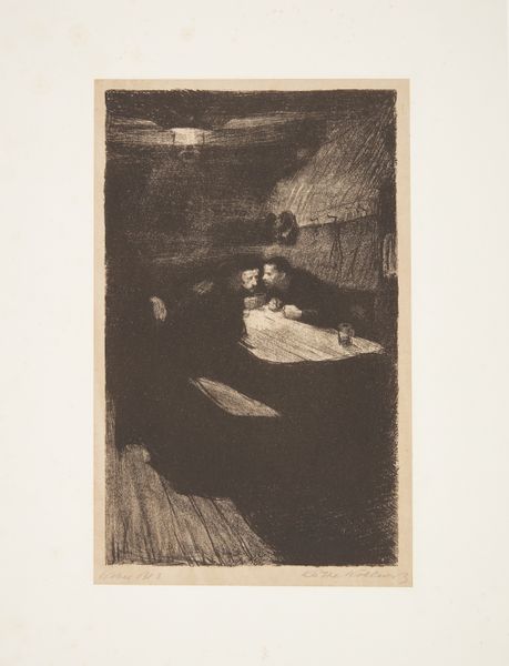 Curator: Edgar Degas's "At the Café des Ambassadeurs," dating from 1879 to 1880, presents an enigmatic glimpse into Parisian nightlife. Crafted using etching, this piece showcases Degas's exploration of modernity through the lens of printmaking. It's currently housed here at the Art Institute of Chicago. Editor: My first impression? It feels incredibly…moody. Like catching a fleeting moment in a smoky, dimly lit room. The figures seem caught between clarity and shadow, a whisper of a story. Curator: Indeed. The stark contrast achieved through the etching technique underscores this. Notice the compositional strategy: Degas's keen awareness of spatial arrangement—the figures distributed non-symmetrically creates dynamic tension. Editor: Absolutely! There’s almost a stage-like quality about the setting, the figures positioned as performers, or perhaps, nonchalant observers within the café's vibrant microcosm. It’s as if Degas handed us backstage passes to the human drama! Curator: Consider the gestural quality of the lines, particularly around the faces. These are not merely portraits but attempts to capture character, mood, and psychological states. One could argue he presages cinematic narrative techniques. Editor: It's more than a little voyeuristic too, wouldn't you agree? Like we’re intruding on a private interaction, a secret shared in hushed tones under the glow of those gas lamps. Curator: The use of light and shadow transcends simple representation. The bright glare may act to reveal as well as conceal, speaking volumes about class and societal roles within Impressionist artwork. The light might also subtly symbolize themes like revelation and exposure, ideas constantly negotiated in fin-de-siècle art. Editor: Exactly, there's a cinematic allure in that the whole tableau feels like a fragment from a bigger narrative; a split second from someone's lifetime, beautifully rendered. Curator: Through an intricate framework of lines and tonal graduations, the setting breathes with a palpable vitality, a microcosm encapsulating life, intimacy, and transient reality. It serves as both a documentation of and a critical inquiry into modernity. Editor: Degas managed to squeeze poetry into a cityscape… or perhaps, capture life and transform it into visual haikus! His gift captures a split-second narrative where stories begin and secrets linger on the paper's very grain. Bravo, sir!