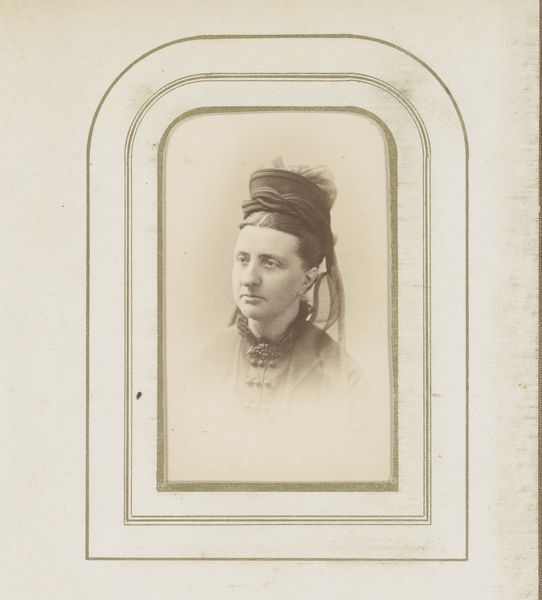 Editor: Here we have "Portret van een vrouw met hoofddeksel en medaillon," made between 1860 and 1900, attributed to J. Tomáš. It's an albumen print photograph. What strikes me is the formality – a real contrast between the woman’s almost severe expression and the elaborate headwear. What's your read on this portrait? Curator: My interest lies in the materiality of this image. The albumen print process itself, labor-intensive and requiring specific materials – glass plate negatives, egg whites, silver nitrate – speaks volumes. It wasn't a democratic medium at this time; think about the resources needed. The elaborate headwear and medallion, signifiers of status, wouldn’t be accessible to most women of the era. This image then becomes an artifact of social stratification, a product of specific material conditions that reinforce existing power structures. Does this change how you see the image, knowing something about albumen prints? Editor: It does! I hadn’t considered the privilege inherent in simply *having* a portrait done. The materials tell a story of access and wealth. I was focused on the sitter’s face, but now I see the whole photograph as a manufactured object, showcasing resources as much as likeness. Curator: Exactly. And beyond the creation of the image, think of its consumption. This wasn’t a fleeting digital image; this was an object intended for display, preservation, a family archive. How would its meaning shift as a physical object passed through different hands over generations? It gives us access into this person’s legacy as this photo will always serve as material representation of them. Editor: So it's not just *who* is in the photo, but how the photo itself was made, preserved, and used that tells the real story. Curator: Precisely! It underscores the necessity to always think of art's production, circulation, and consumption as key factors shaping our interpretations. Editor: Thanks for showing me the materials underneath it all!